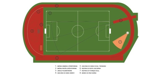 Zakres prac: przebudowa boiska do piłki nożnej o nawierzchni z trawy naturalnej, budowa bieżni lekkoatletycznej 4-torowej okrężnej (6 torów) o nawierzchni poliuretanowej o długości 400 m, budowa skoczni w dal i wzwyż, budowa rzutni do pchnięcia kulą i rzutu oszczepem, zagospodarowanie terenu.